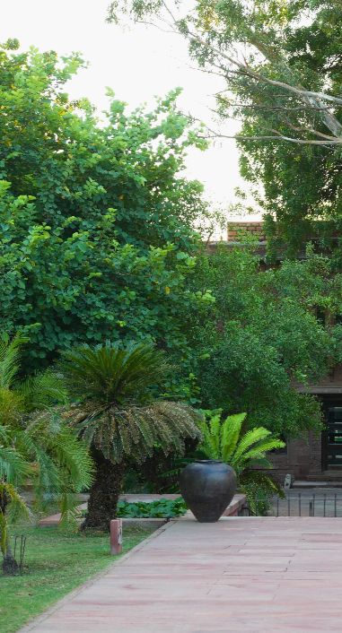 Welcome to Sukh Sagar Haveli, a heritage property that has been my home since 2001. Tucked away from the busy streets of Jodhpur, this small haveli dating back to the turn of the 20th Century lies on two and a half acres of land on the outskirts of the city. Framed by a large stone archway at the main gates, the beautiful haveli remains the focal point of the property. On either side of the magnificent entrance, bedrooms and living areas have been built around a central courtyard with views over the lawns. This symmetry allows for space and privacy for visiting guests. All suites have access to the many living spaces and open terraces on the grounds of the property. Guests can use the swimming pool whenever they feel the urge to take a dip!